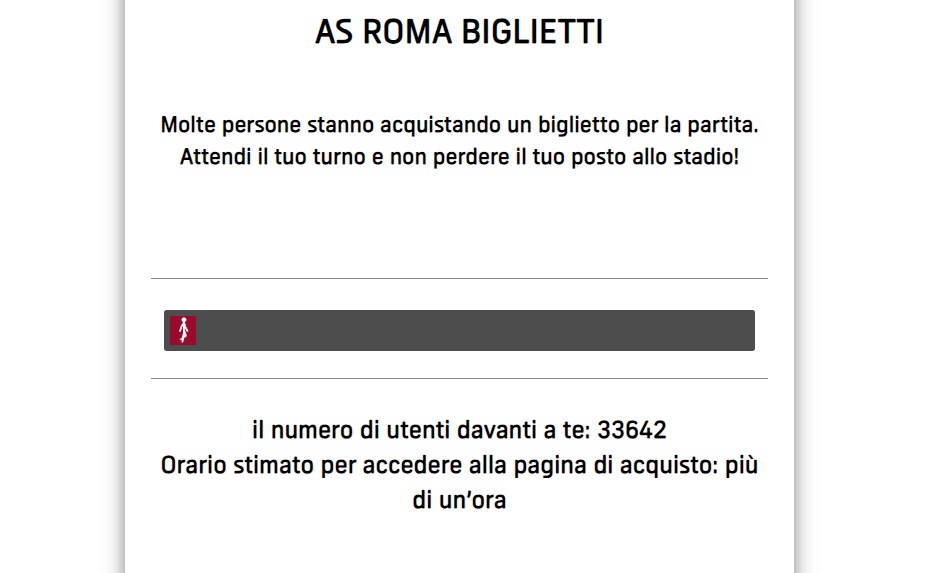 Alle ore 15 è iniziata la vendita libera e ogni tifoso potrà acquistare 4 biglietti per singola transazione. Lunghissime code sul sito della Roma per comprare i ticket: dopo circa mezz’ora oltre 33 mila persone in attesa del proprio turno.
