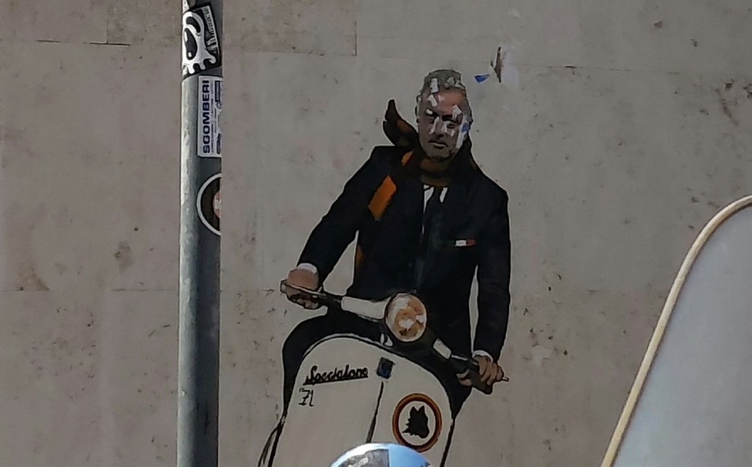 ULTIME NOTIZIE AS ROMA – Già rovinato il murale realizzato giorni fa a Testaccio che rappresentava Josè Mourinho intento a girare per Roma con una Vespa.
