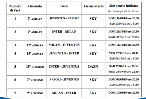 “All’esito della pubblicazione del Calendario della Serie A TIM 2018/2019 avvenuta con C.U. n. 9 del 26 luglio 2018 e in attuazione di quanto previsto al punto 4.1 del C. U. n. 8 del 25 luglio 2018 (Giorni e Orari di Gara – Regole per l’esercizio dei Pick relativi alle 20 Gare “Top match”), si comunicano di seguito le scelte operate dagli assegnatari dei Pacchetti di diritti audiovisivi esclusivi per le dirette a pagamento sul territorio italiano, SKY (Pacchetti 5 e 6) e DAZN (Pacchetto 7), relativamente agli slot orari in cui collocare le 20 Gare “Top Match” di Serie A”.