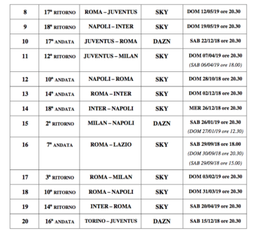 “All’esito della pubblicazione del Calendario della Serie A TIM 2018/2019 avvenuta con C.U. n. 9 del 26 luglio 2018 e in attuazione di quanto previsto al punto 4.1 del C. U. n. 8 del 25 luglio 2018 (Giorni e Orari di Gara – Regole per l’esercizio dei Pick relativi alle 20 Gare “Top match”), si comunicano di seguito le scelte operate dagli assegnatari dei Pacchetti di diritti audiovisivi esclusivi per le dirette a pagamento sul territorio italiano, SKY (Pacchetti 5 e 6) e DAZN (Pacchetto 7), relativamente agli slot orari in cui collocare le 20 Gare “Top Match” di Serie A”.