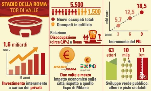 In secondo luogo, si ridurrebbe anche il problema danni da esondazioni dei due fossi e da fenomeni franosi per i circa 500mila metri quadri di immobili della zona, un problema quantificato incirca 50 milioni di euro. Inoltre, si decongestionerebbe la mobilità del quadrante grazie agli investimenti sulle strade e per il trasporto pubblico. I 62 ettari di verde, dove so no previste 10mila nuove alberature, che compenserebbero l’abbattimento di 30 alberi necessario per la realizzazione dello svincolo a Parco de’ Medici, costituirà un vero e proprio nuovo polmone verde e, grazie al sistema di videosorveglianza in grado di identificare anche i volti delle persone, potrà anche ridurre il rischio di incendi dolosi. Infine, il lato economico: lo studio certifica che con Tor di Valle si genererà un significativo incremento del Pil pari a 5,7 miliardi di euro dopo 3 anni (2020) fino a 18,5 miliardi dopo 9 anni (2026) rispetto a quello che si avrebbe se lo Stadio non si facesse. Alla crescita economica si accompagna anche la riduzione del tasso di disoccupazione per lo 0,8%, con 5.500 nuovi posti di lavoro più i 15-20mila lavoratori nel Business Park. Anche per il cassiere del Comune lo Stadio rappresenterebbe una festa con un incremento annuale medio delle entrate fiscali per il Campidoglio: 30 milioni dieu ro entro fine 2025 di gettito cumulato cui vanno aggiunti gli introiti diretti. L’ impatto economico sulla città sarebbe pari a circa due volte e mezzo quello prodotto da EXPO 2015 su Milano e superiore del 68% di quello generato dal Giubileo della Misericordia. L’ impatto sulla Regione Lazio sarebbe pari a una volta e mezzo quello prodotto da EXPO per Regione Lombardia. Insomma un grande affare. Per tutti.