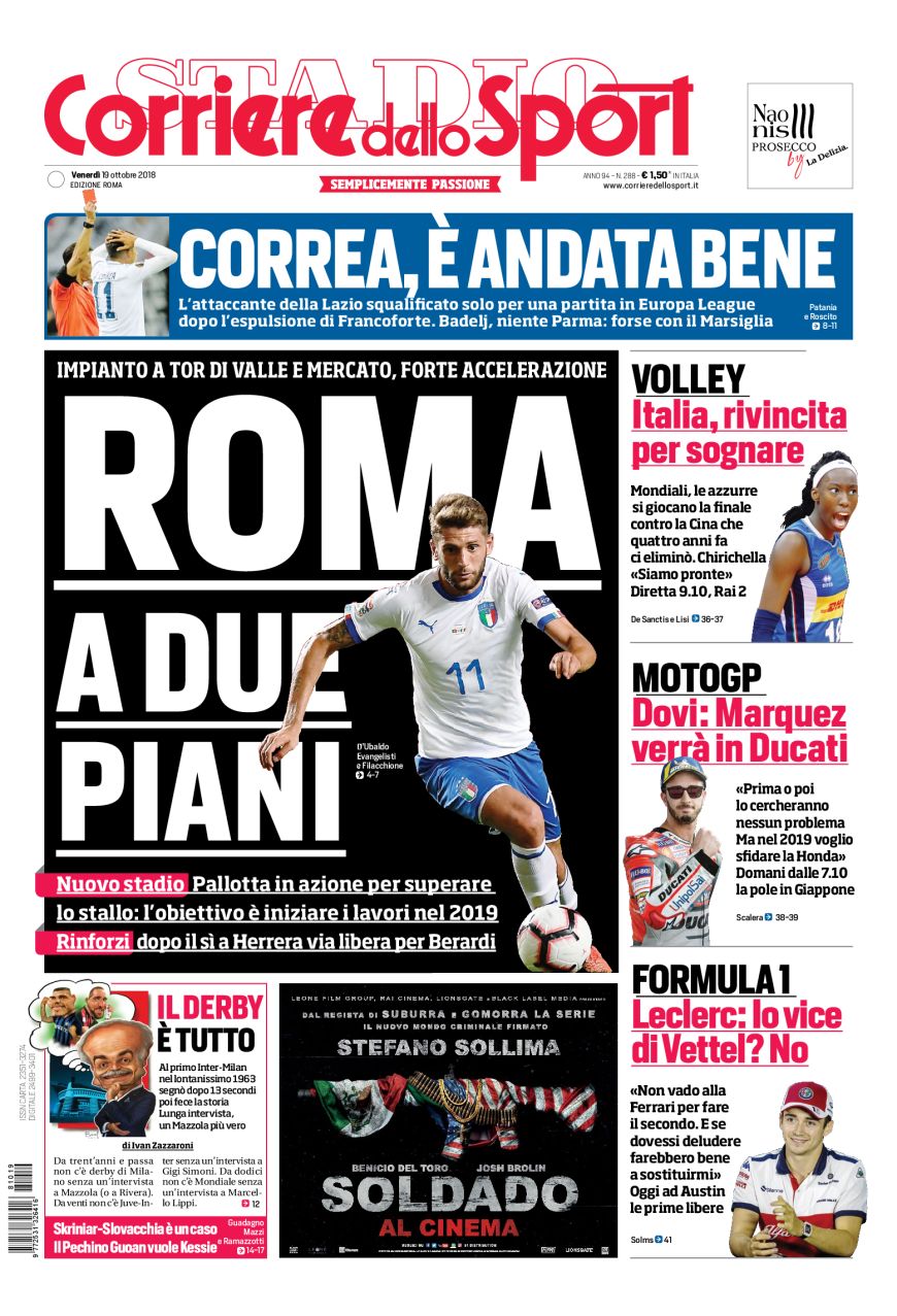 AS ROMA NEWS“Roma a due piani”. Apre così l’edizione romana del Corriere dello Sport, che punta forte su due argomenti caldi trattati dalla dirigenza della Roma volata a Boston per incontrare il presidente Pallotta.