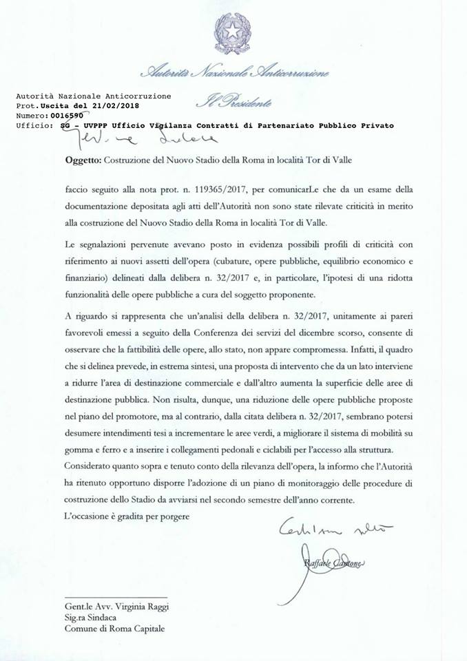 ma che vor di ! ANAC anti corruzione…… ma de che. Boh ! Quanta gente deve da parlà ancora !!!!!!! E annamo co sto stadio, cio settantanni e voglio vede almeno una partita della mia amata ROMA nello stadio della AS ROMA.