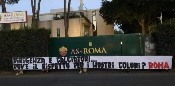 “Dirigenti assenti, squadra senza dignità…siete la vergogna di questa cittá, è il testo del primo. Dirigenza e calciatori, dov’è il rispetto per i nostri colori?, si legge nel secondo striscione, apparsi ieri a Trigoria.