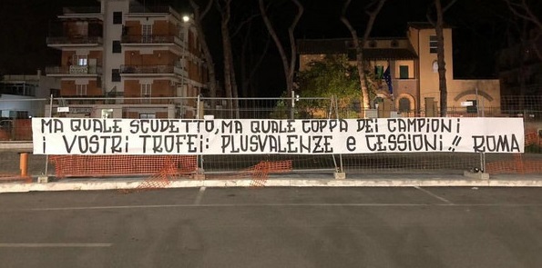 AS ROMA NOTIZIE – La rabbia dello zoccolo duro si è fatta sentire già nella notte di venerdì. Una frangia degli ultrà della Roma, infatti, ha appeso uno striscione pieno di sconforto: «Ma quale scudetto, ma quale coppa dei Campioni. I vostri trofei: plusvalenze e cessioni».