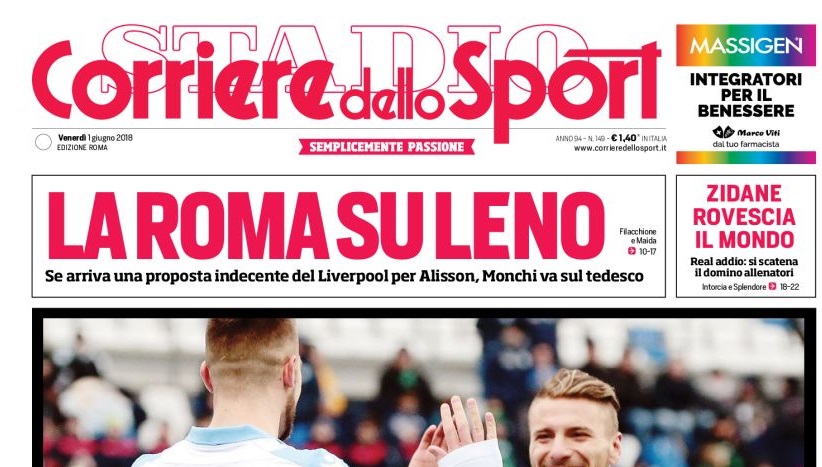 ALISSON A PESO D’ORO, ROMA SU LENO – Il Corriere dello Sport si dedica alla Roma e al suo portiere Alisson, come sempre al centro delle voci di mercato e conteso a peso d’oro dai principali club europei. Monchi però si sarebbe già cautelato andando a bloccare Bernd Leno, portiere tedesco del Bayer Leverkusen di 26 anni.
