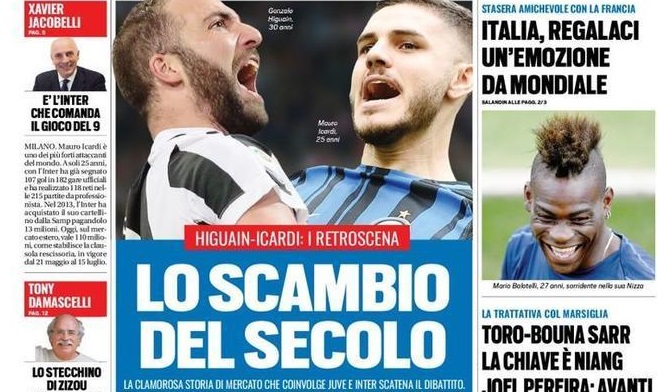 ICARDI-HIGUAIN, E’ LO SCAMBIO DEL SECOLO – Ma grande attenzione viene posta anche sul possibile e clamoroso scambio di attaccanti che sembra sempre più possibile tra Inter e Juve: Higuain finirebbe da Spalletti, mentre Icardi andrebbe alla corte di Allegri. Tuttosport oggi svela i retroscena di una trattativa che potrebbe prendere il volo molto presto.