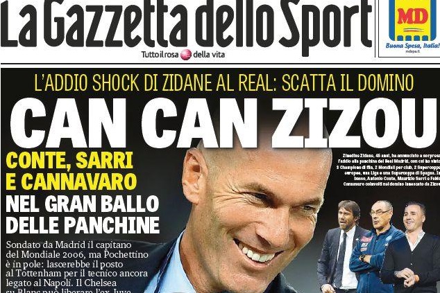 L’ADDIO DI ZIDANE AL REAL SCATENA UN EFFETTO DOMINO – Le prime pagine dei giornali si rivolgono tutte all’addio imprevisto di Zinedine Zidane al Real Madrid e all’affetto a catena che avrà sulle panchine di diversi club europei. Per la panchina dei Blancos spunta addirittura Cannavaro oltre che Antonio Conte, ma in pole al momento c’è Pochettino. Sarri a quel punto potrebbe finire al Tottenham, o al Chelsea se il prescelto dovesse essere l’ex ct della Nazionale.