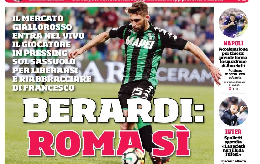 BERARDI SPINGE, VUOLE LA ROMA – E l’edizione romana del Corriere dello Sport punta forte proprio sull’attaccante del Sassuolo, che starebbe spingendo sul club neroverde per lasciarlo andare da Di Francesco. Il titolo a tutta pagina è eloquente: “Berardi, Roma sì”.Â