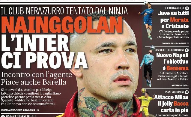 GASPORT: “IL CLUB NERAZZURRO TENTATO DAL NINJA” – La Gazzetta dello Sport apre, ma non è una novità , con un giocatore della Roma corteggiato dall‘Inter. Si tratta di Radja Nainggolan: era successo già lo scorso anno, ora la notizia torna prepotentemente in prima pagina. “Nainggolan, l’Inter ci prova”, scrive il quotidiano sportivo milanese in apertura. Ausilio ha incontrato l’agente del calciatore belga, la Roma chiede 40 milioni per lasciarlo partire.