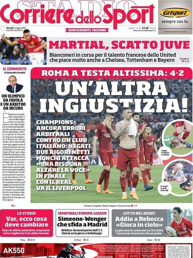 Spinge molto di più sulla direzione arbitrale il Corriere dello Sport, che oggi titola: “Un’altra ingiustizia!”, facendo riferimento al furto perpetrato ai danni della Juve in favore del Real Madrid. “Ancora errori arbitrali contro un club italiano. Negati due rigori netti”.