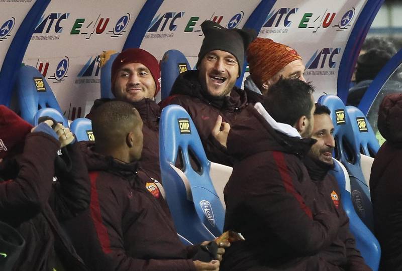 NOTIZIE AS ROMA – Non ha spazio in campo, si diverte fuori. Totti, come a Reggio Emilia contro il Sassuolo, dà spettacolo in panchina. E’ seduto in mezzo agli altri due senatori Torosidis eDe Sanctis. In seconda fila. Davanti, in prima, c’è il team manager Zubiria. Che però lascia momentaneamente il suo posto. Il capitano se ne accorge e versa, sul suo seggiolino, mezza bottiglia d’acqua. Quando il dirigente va a sedersi, fa una faccia strana. Si alza di nuovo,ma ormai i pantaloni sono bagnati. Daniele Baldini assiste alla scena. Ma non può aiutare Zubiria.