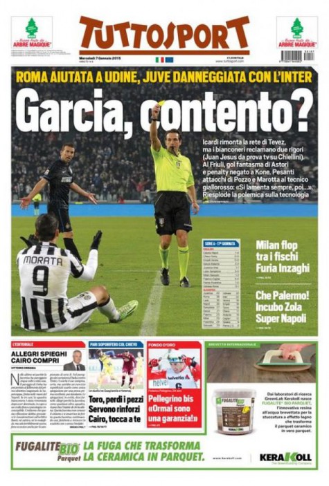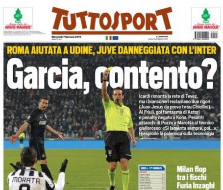 AS ROMA NEWS – Altro pesante attacco a Rudi Garcia da parte del quotidiano torineseTuttosport“, che questa mattina titola a tutta pagina con un eloquente: ”Garcia, contento?”. Secondo il giornale la Roma sarebbe stata chiaramente aiutata a Udine, mentre la Juventus avrebbe subito dei torti nel pareggio interno contro l’Inter di Mancini.