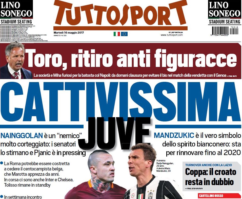Il giornale apre a tutta pagina con il titolo “Cattivissima Juve”, e si svela come il nemico Nainggolan sia comunque un obiettivo di mercato. I senatori lo stimano e il suo ex compagno di squadra Miralem Pjanic è in pressing per convincerlo a trasferirsi a Torino. La Roma, prosegue Tuttosport, potrebbe essere costretta a vendere il belga davanti a una cifra importante: anche Inter e Chelsea spingono per avere il Ninja.