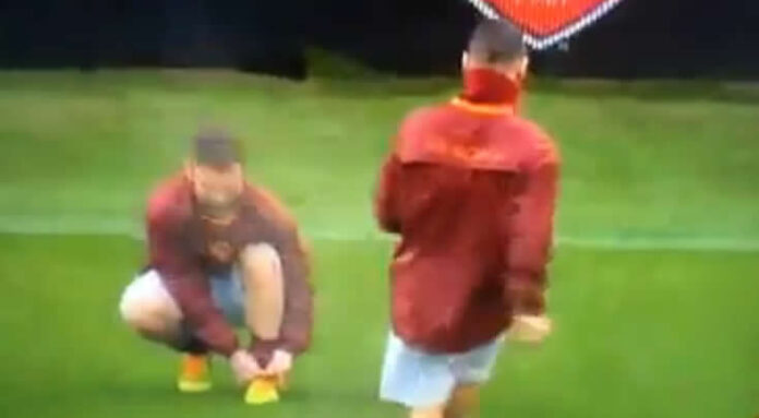 AS ROMA NEWS (CORSPORT.IT) –Â Durante il riscaldamento prima della partita col Parma (sospesa per pioggia) il capitano della Roma Francesco Totti scherza in allenamento e “innaffia” De Rossi che non la prende molto bene…