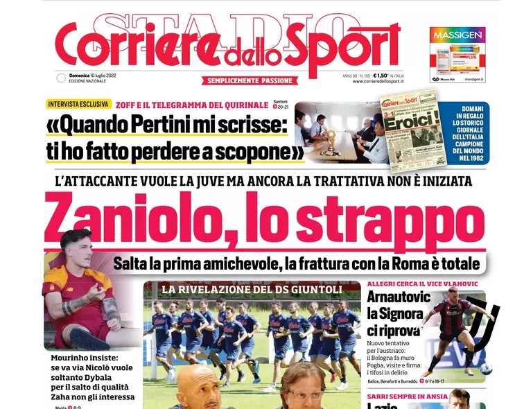 “Zaniolo, lo strappo” titola a tutta pagina il Corriere dello Sport, che parla di “rottura totale” tra il club e il giocatore: il presunto mal di schiena che avrebbe reso indisponibile il giocatore non è stato confermato dall’agente del giocatore.