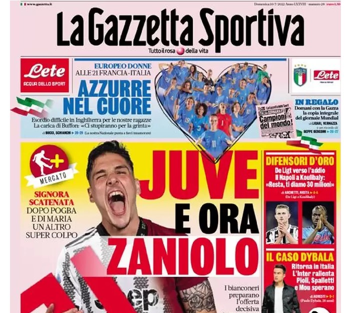 Anche la Gazzetta dello Sport dedica la sua prima pagina interamente a Zaniolo, vestendolo addirittura con la maglia bianconera. “Juve, e ora Zaniolo”, titola il quotidiano sportivo milanese. Cherubini sta preparando un’offerta da 50 milioni tra prestito e obbligo di riscatto, spalmato su più anni.